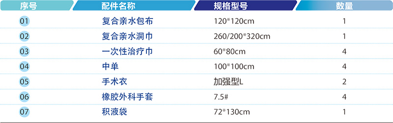 適用于胸腹外科手術(shù),產(chǎn)品主要由高性能無(wú)紡布制成的包布、洞巾、一次性治療巾、中單、手術(shù)衣和外科手套等配件組合而成。洞巾由復(fù)合親水無(wú)紡布制成,手術(shù)關(guān)鍵部位配備有吸液層和集液袋,可根據(jù)臨床需要更改手術(shù)包內(nèi)配件數(shù)量。