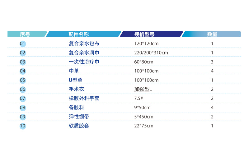 適用于髓關(guān)節(jié)部位手術(shù),產(chǎn)品主要由高性能無(wú)紡布制成的包布、洞巾、中單、U型單、手術(shù)衣和彈性繃帶、軟質(zhì)膠套等配件組合而成。洞巾手術(shù)關(guān)鍵部位配備有吸液層、彈性膜和集液袋,可根據(jù)臨床需要更改手術(shù)包內(nèi)配件數(shù)量